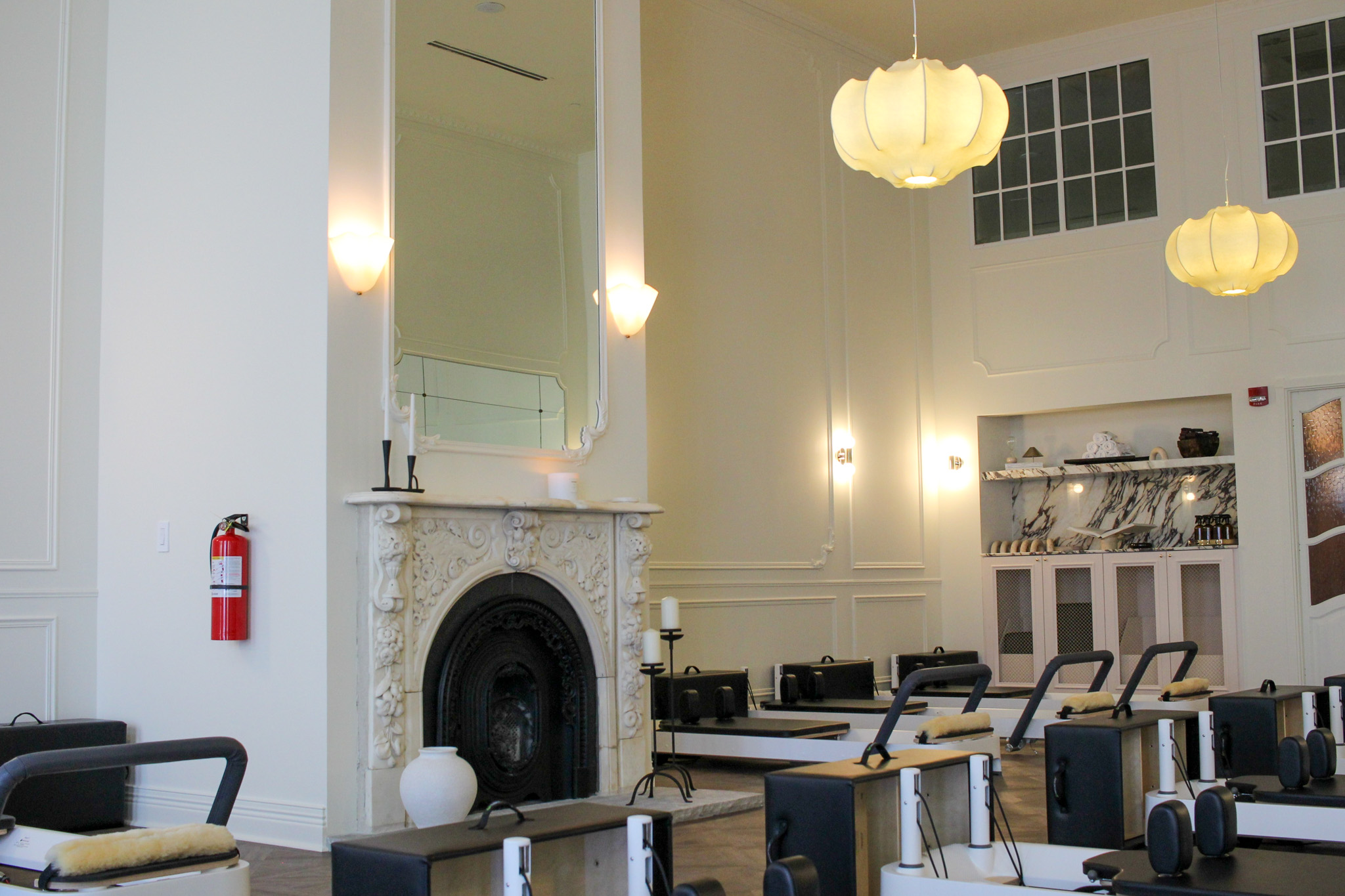 This new Forza Pilates studio in Franklin, TN combines luxury design with high-performance reformer Pilates classes. Custom finishes and thoughtful accents create an elevated, purposeful space. A grand fireplace anchors the main studio, adding warmth and elegance to every workout. A wooden staircase leads to a mezzanine, perfect for private sessions and curated wellness events. The expansive locker room feels like a feature itself, complete with a vanity, soft lighting, and sophisticated design. Every detail encourages movement, connection, and community. Forza Pilates offers a refined, boutique fitness experience right here in Franklin.